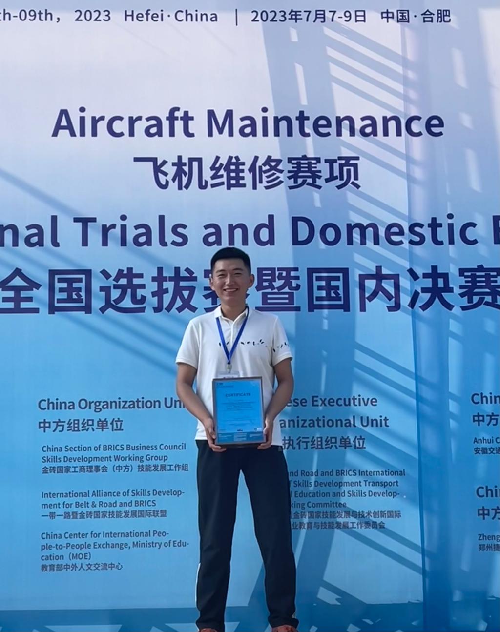 7月7日-9日,金砖国家职业技能大赛“飞机维修”赛项在安徽交通职业技术学院举行,来自全国24个省、市、自治区的36支高职院校代表队参加了比赛。该赛项包括直升机日常检查、航空发动机燃烧室拆装与排故、飞机液压系统排故三个比赛模块,重点考察参赛选手维修基本技能、规范化操作能力以及航空维修职业素养养成,检验选手个人比赛综合能力以及安全意识和质量意识。航空工程学院2021级飞机机电设备维修专业刘荣奎同学参赛,经过激烈角逐,最终获得全国第八名、个人二等奖,黄明友老师被评为优秀指导专家。