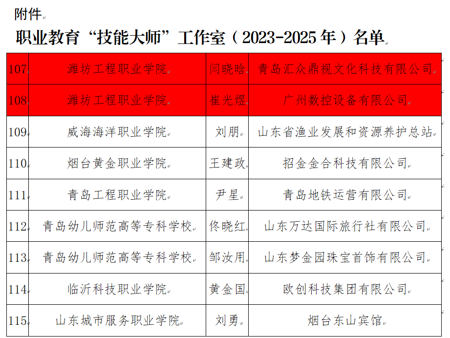 近日,山东省教育厅公布职业教育“技能大师”工作室(2023-2025年)名单,我校“潍坊工程职业学院+青岛汇众鼎视文化科技有限公司+新一代信息技术‘技能大师’工作室项目”“潍坊工程职业学院+广州数控设备有限公司+装备制造‘技能大师’工作室项目”获批职业教育“技能大师”领航计划(2023—2025年)项目立项。下步,学校将以职业教育“技能大师”工作室项目建设为契机,紧密围绕新型产业和主导产业紧缺技术岗位人员需求,充分发挥技能大师辐射带动和“智库”作用,建设高技能人才培养平台,带动学校 “金师”打造,进一步探索形成一批专业链、产业链、人才链、创新链深度融合的高技能师资培养经验和技术技能人才培养标准,推动学校高质量发展。