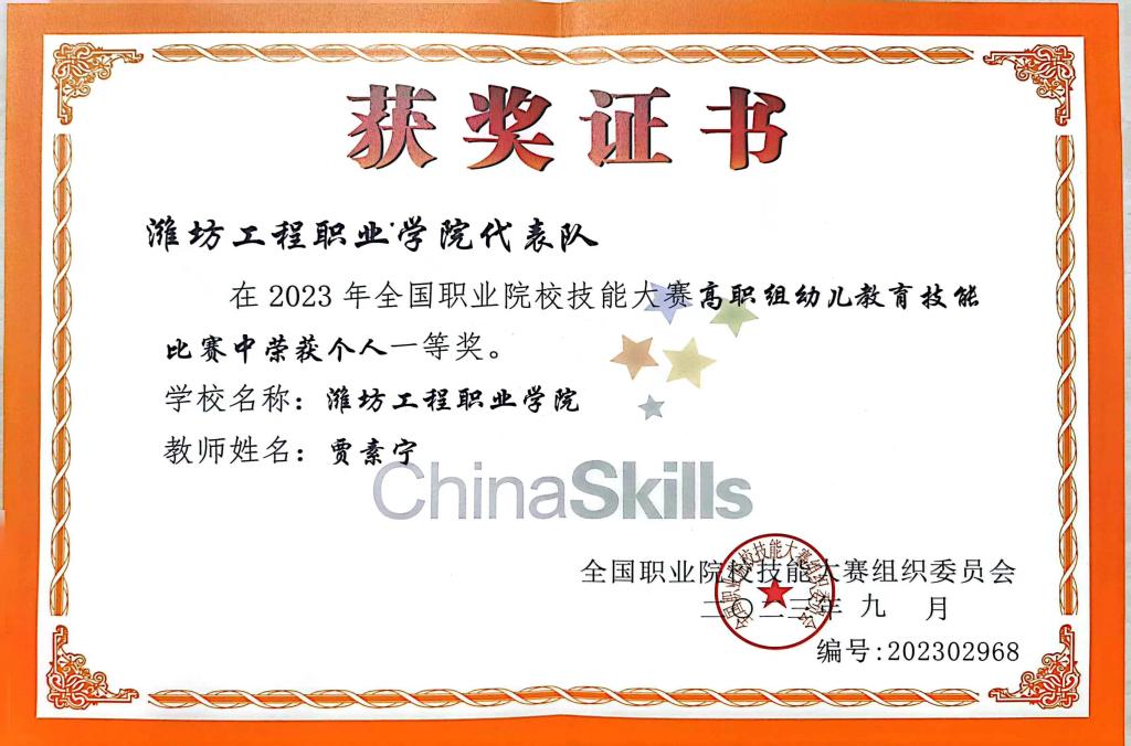 9月1日至2日,全国职业院校技能大赛(高职组)“幼儿教育技能”(教师赛)在黑龙江幼儿师范高等专科学校举办,我校青年教师贾素宁与来自全国多所高职院校的教师同场竞技,凭借扎实的教学基本功和良好的专业素养,在竞争激烈的国赛中突出重围,获全国一等奖,这是学校标志性成果的再次重大突破。