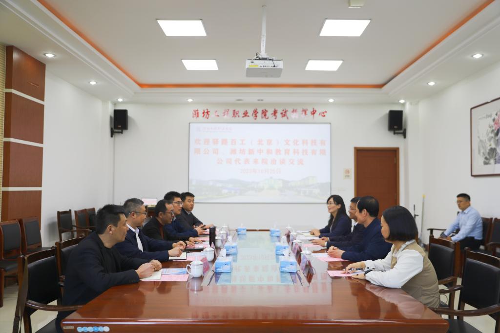 10月25日,驿路百工(北京)文化科技有限公司负责人、潍坊新中和教育科技有限公司相关负责人一行5人来院访问,洽谈国际合作办学事宜,学院党委书记吕尧良、副院长冯永光出席会议,国际交流学院、农林科技学院相关人员参加活动。