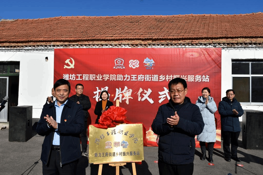 11月24日,潍坊工程职业学院助力王府街道乡村振兴服务站揭牌仪式在七迴峪村举行。学院党委副书记王金明,党委委员、组织人事处处长赵凤卿,王府街道人大工作室主任李文波、党委副书记孙翠生及驻村第一书记侯文元、相关二级学院负责人等参加揭牌仪式。