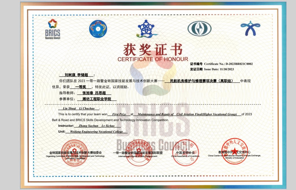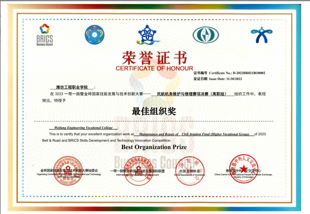 11月28日至30日,2023年一带一路暨金砖国家技能发展与技术创新大赛“民航机务维护与修理”赛项在武昌职业学院举办,来自全国58支参赛队伍、116名选手展开激烈角逐,我院学生刘树旗、李储超以总分第2名的成绩获一等奖,航空工程学院教师张旭春、吕思超获评优秀指导教师,潍坊工程职业学院荣获最佳组织奖。根据比赛规程,获得前两名的队伍,享有优先出国或线上远程参加相关赛项国际竞赛的资格。