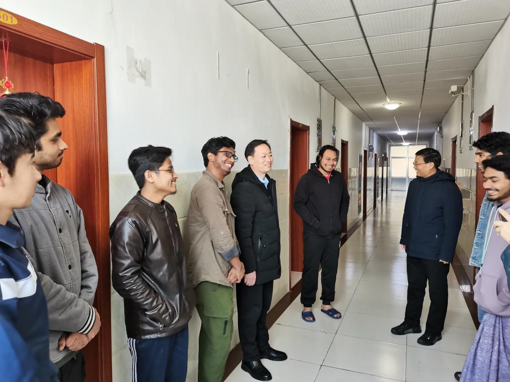 2月5日下午,学院党委书记吕尧良,党委委员、党政办公室(统战部)主任(部长)高乐江深入留学生公寓,看望慰问寒假留校的国际学生,国际交流学院负责人参加活动。