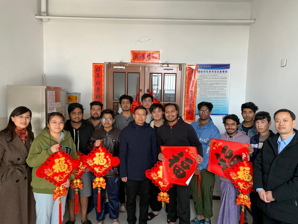 吕尧良与国际学生亲切交谈并送去新春的祝福,详细了解他们的学习生活情况,讲述了中国春节相关文化,鼓励国际学生在专业学习之余,多领略中国传统文化的魅力。来自孟加拉国的萨米代表国际学生用流利的汉语表达了对学院领导老师的感谢和新年祝福。