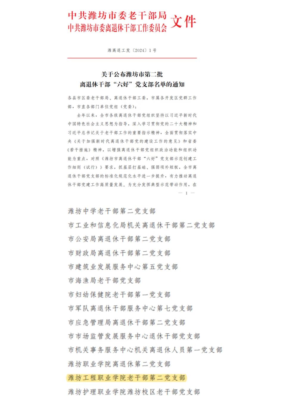 近日,潍坊市委老干部局、潍坊市委离退休干部工作委员会公布了潍坊市第二批离退休干部“六好”党支部名单,我院老干部第二党支部成功入选。