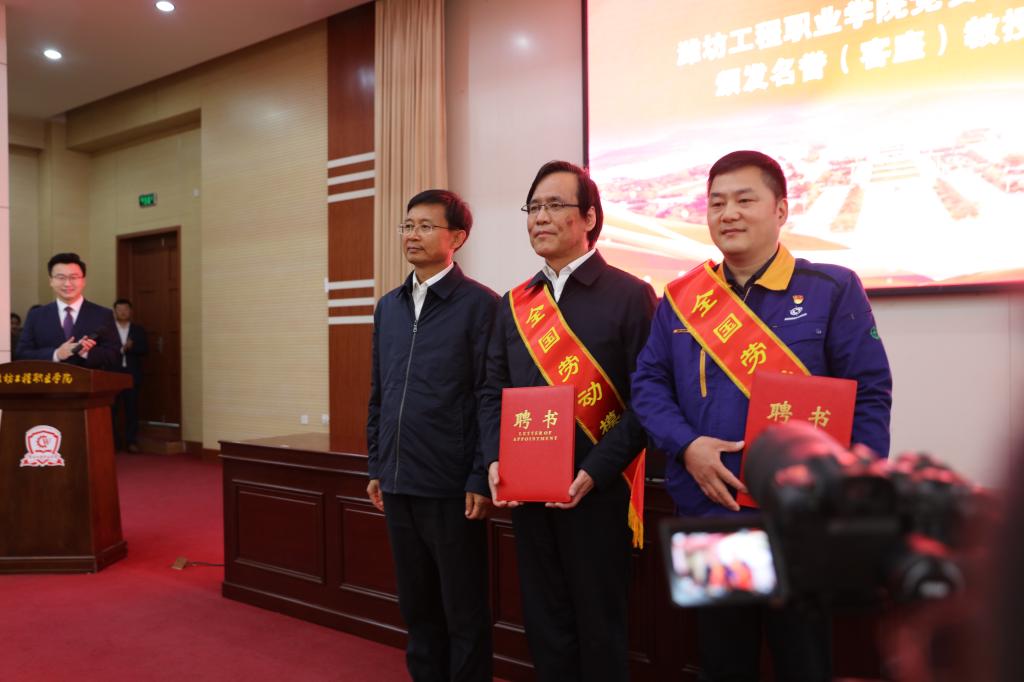 活动邀请中国航天科技集团有限公司第一研究院211厂14车间高凤林班组组长、中华全国总工会副主席(兼),全国劳模、大国工匠年度人物高凤林;中国兵器工业集团首席技师、西北工业集团钳工高级技师,全国劳动模范、大国工匠张新停分享成长心得。中国国防邮电工会国防科技工作部部长张培立,山东省总工会党组书记、常务副主席石爱作,山东省教育工会主席王贞,潍坊市人大常委会党组副书记、副主任,市总工会主席田民利,潍坊市总工会党组书记、常务副主席贾平,潍坊工程职业学院党委书记吕尧良,青州市委副书记蒋建新,青州市政协党组副书记、副主席,市总工会主席杨爱东,以及院领导王金明、高乐江、赵凤卿、付小政出席活动。活动中,吕尧良为大国工匠高凤林、张新停颁发学院名誉教授、客座教授聘书。