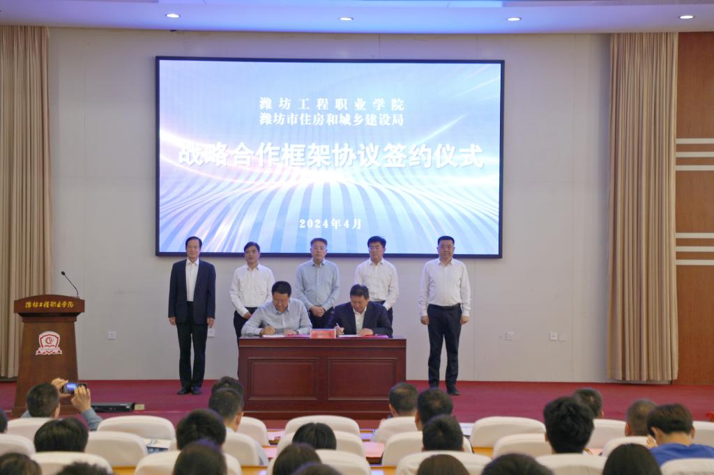 揭牌仪式上,李晓从乡村建设工匠大有可为、提升工匠技能大有必要、助力乡村工匠大有作为三个方面,强调了乡村建设工匠培训的重要性,对潍坊市及各县市区住建部门在乡村工匠培养方面提出更高要求,希望我院加强培训师资队伍建设,培养一批素质过硬、技能突出的“乡村建造师”“工程指导师”,为培养高质量乡村建设人才作出积极贡献。王金明介绍了学院发展以及我院在乡村建设培训中的经验和做法,表示学院将充分发挥专业、人才、技术等优势,积极响应国家乡村振兴战略,为乡村建设提供全方位的支持。王文成在讲话中指出,乡村振兴需要一批具备专业技能和实践经验的乡村建设工匠,学院作为人才培养的摇篮,必将为乡村建设提供坚实的人才保障。会上,赵庆松和张希林分别代表学院、潍坊市住建局签署了“乡村建设工匠”培训战略合作框架协议书,马冰和冯永光为潍坊市智能建造产教融合实践中心揭牌,李晓和王金明为潍坊市乡村建设工匠培训基地揭牌。