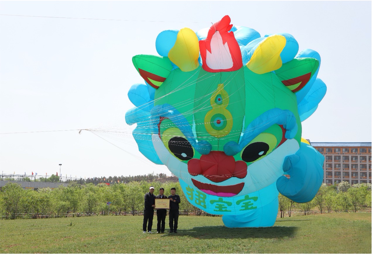 本次获奖的“峱宝宝”风筝是由我院数字文创产业学院师生共同设计制作的巨型风筝,长约20米、宽约15米、厚约15米,总体积约4500立方米。风筝以青州瑞兽--“峱”为原型,形如貔貅,色调以青蓝色为主,既蕴含着深厚的传统文化,又洋溢着新时代精神,承载着人们对美好生活的向往。比赛中,参赛队员密切配合、团结合作,圆满完成放飞任务,展现了昂扬的风采和积极的精神面貌。
