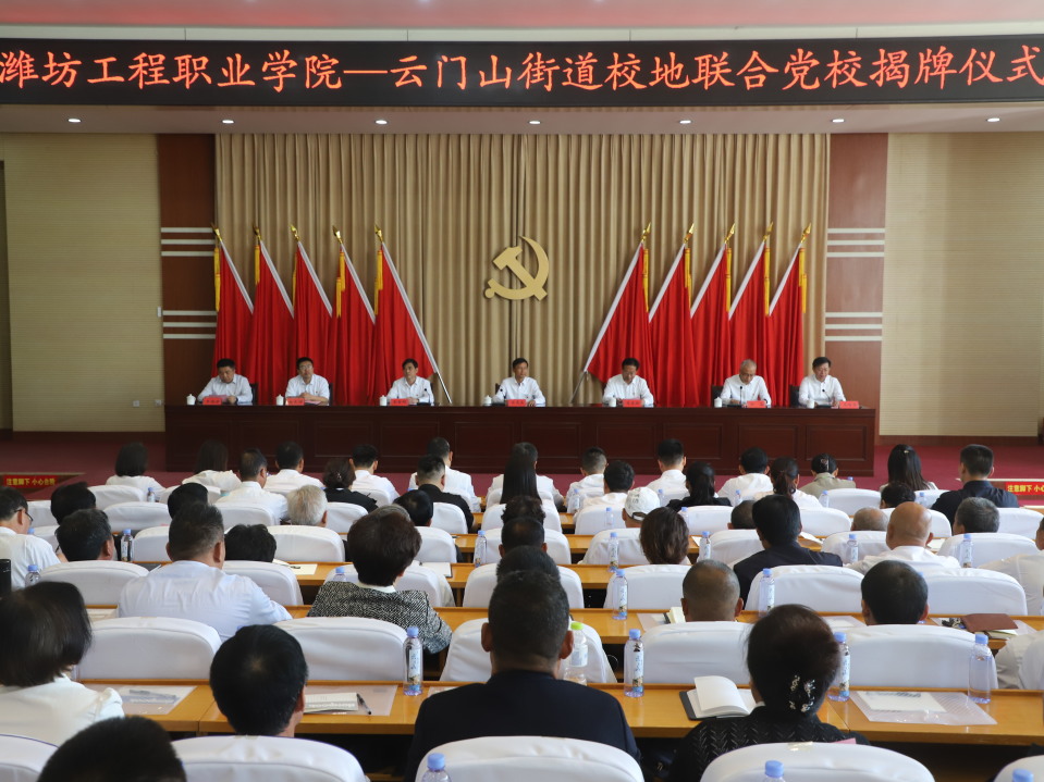 5月8日上午,潍坊工程职业学院—云门山街道联合党校揭牌仪式在学院报告厅举行。学院党委书记吕尧良,党委副书记王金明,青州市委副书记蒋建新,市委常委、组织部部长郑海,青州市委党校党委会主任、副校长赵长顺,市委组织部副部长王福涛出席揭牌仪式,云门山街道全体领导干部、各社区书记、各村及两新组织、机关党支部书记及部分社区党员参加。
