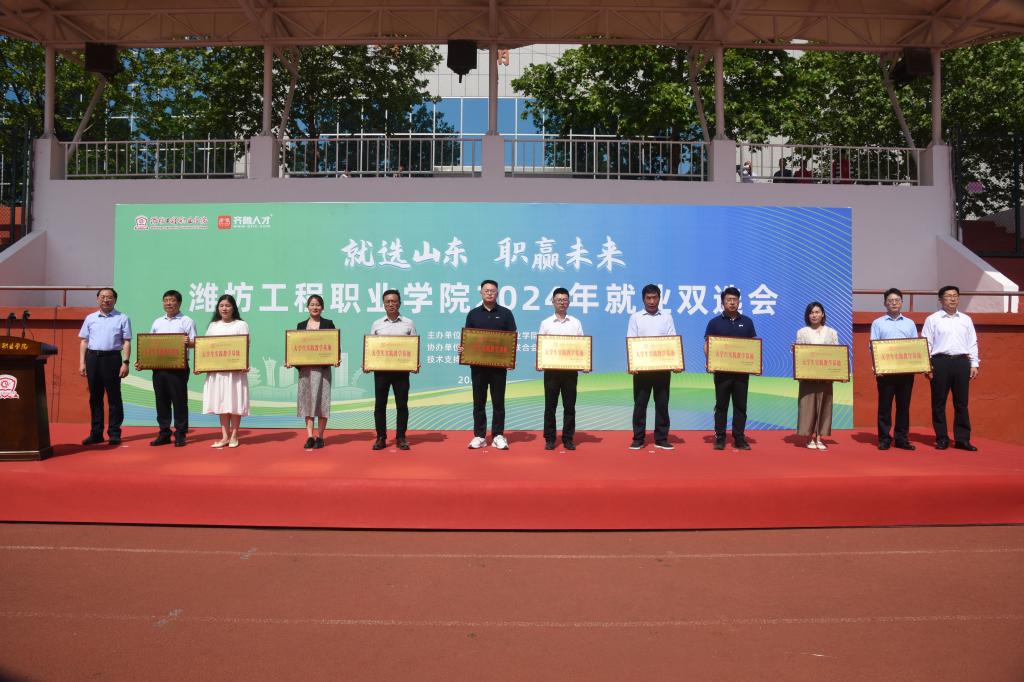 开幕式上,王忠山发表致辞,他代表学院向长期以来关心支持学院就业工作的各位领导、用人单位表示欢迎与感谢。简要介绍了学院办学特色、办学成果及毕业生就业情况,希望2024届毕业生珍惜就业机会,坚定理想信念,做好充分准备,积极主动就业,成就精彩人生。马爱娟、侯增江分别致辞。王忠山和沈志伟共同为10家“潍坊工程职业学院大学生实践教学基地”授牌。