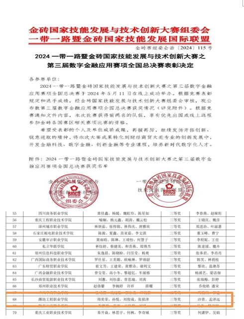 近日,2024一带一路暨金砖国家技能发展与技术创新大赛之第三届数字金融应用赛项全国总决赛在线上举行。在沙青、孟泽远老师的指导下,我院参赛队凭借扎实的理论知识和过硬的团队协作精神在190支参赛队伍中脱颖而出,获得铜牌。