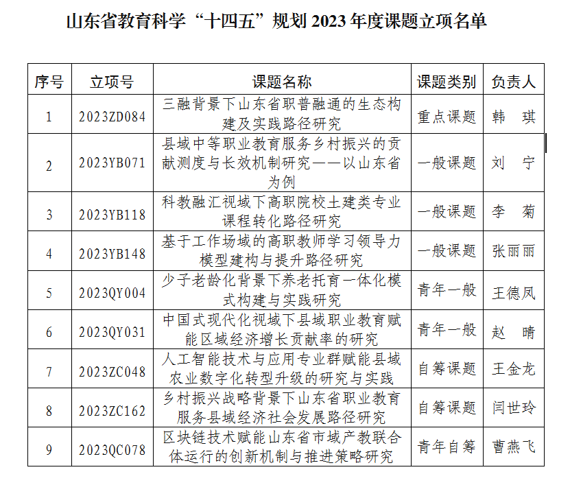 近日,山东省教育科学规划领导小组办公室公布了山东省教育科学“十四五”规划2023年度课题立项名单,我院9项课题获批立项。其中,重点课题1项、一般课题5项、自筹课题3项,立项数量居全省职业院校首位,实现历史性突破。