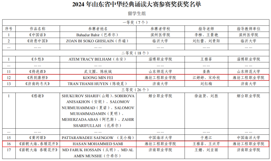 近日,由山东省教育厅、山东省语言文字工作委员会举办的2024年山东省中华经典诵读大赛获奖名单公布,我院报送的留学生作品获二等奖1项、三等奖1项。