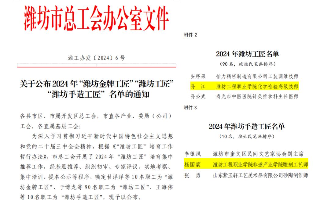 近日,潍坊市总工会公布了全市“潍坊金牌工匠”“潍坊工匠”“潍坊手造工匠”名单。我院农林科技学院教师孙江、非遗产业学院教师杨国震分别荣获“潍坊工匠”“潍坊手造工匠”荣誉称号。