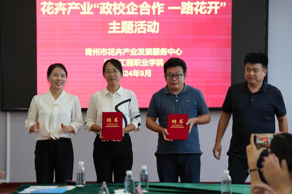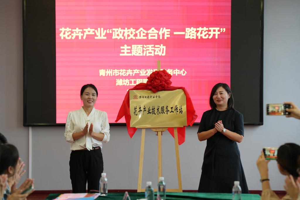 活动中,赵凤卿和于娜娜共同为“潍坊工程职业学院花卉产业技术服务工作站”揭牌,为农林科技学院2名博士教师颁发“青州市花卉产业顾问”聘书。与会人员围绕人才培养模式创新、技术研发合作方向、产业发展瓶颈突破等花卉产业发展的核心问题进行了深入探讨。
