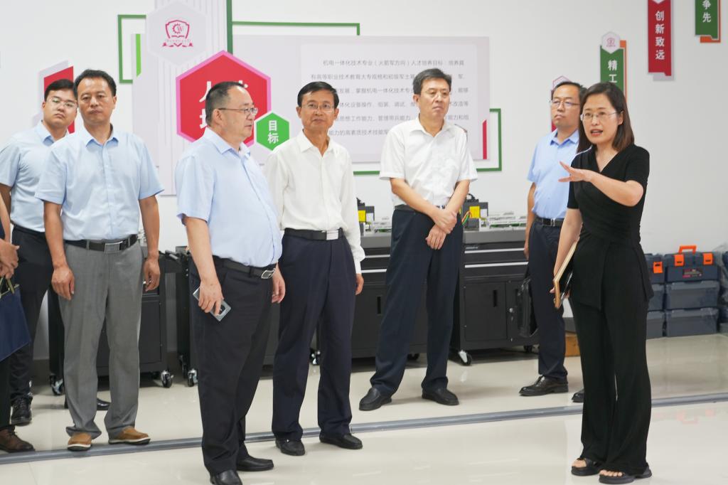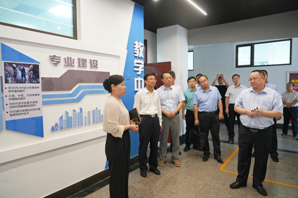 颜军一行还实地考察了虚拟现实产业学院、总线技术实训室和工业机器人操作与运维实训室等,听取了虚拟现实产业学院建设、智慧无人机应用技术虚拟仿真实训基地规划情况介绍。