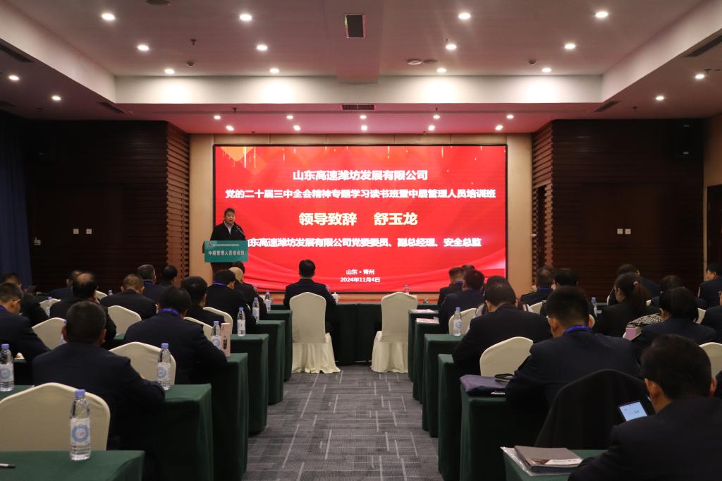 11月4日,山东高速潍坊发展有限公司党的二十届三中全会精神专题学习读书班暨中层管理人员培训班在我院开班。院长王忠山、学院领导王金明出席开班仪式。山东高速潍坊发展有限公司、继续教育学院相关负责人及授课教师等参加开班仪式。开班仪式由王金明主持。