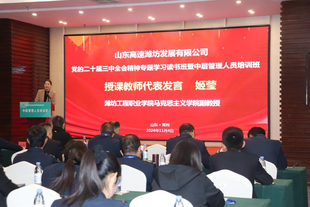 山东高速潍坊发展有限公司党委委员、副总经理、安全总监舒玉龙介绍了本次培训项目的相关情况,并对参训人员提出了具体要求。授课教师代表、马克思主义学院副教授姬莹作了发言。