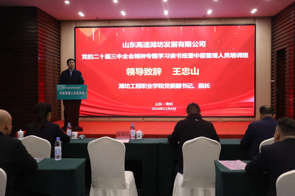 王忠山在致辞中向参加培训的领导和学员表示欢迎,他介绍了学院办学历史及高质量办学情况,并表示学院与山东高速潍坊发展有限公司密切合作、交流互鉴,联合开展了干部员工培训、选拔考试等多项活动,有着良好的合作基础和空间,学院将全力以赴做好培训的各项服务保障工作。