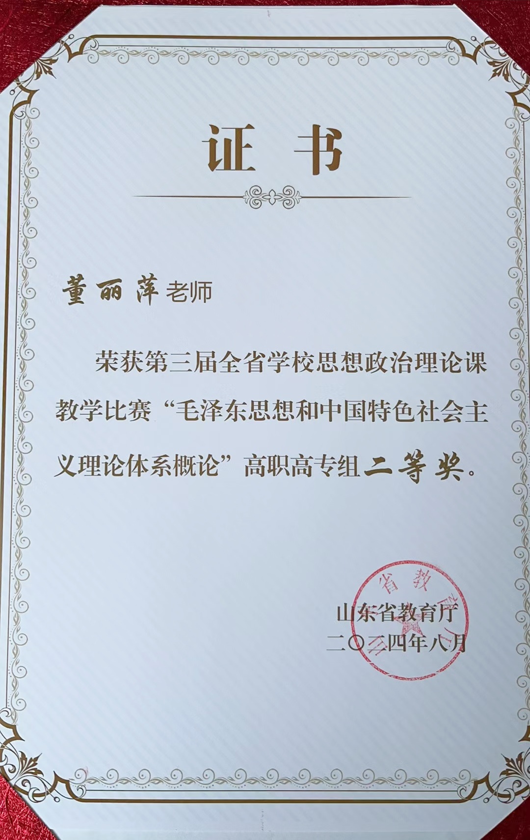 近日,由省教育厅主办的第三届全省学校思想政治理论课教学比赛落下帷幕。我院思政课教师董丽萍、张海婷分获毛泽东思想和中国特色社会主义理论体系概论(高职高专)组、习近平新时代中国特色社会主义思想概论(高职高专)组二等奖。