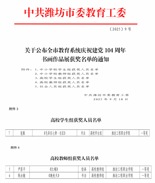 近日,市委教育工委、市教育局公布了全市教育系统庆祝建党104周年书画作品展评选结果,我院师生获一等奖3项、二等奖2项、三等奖2项、优秀奖3项。