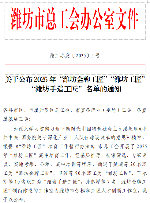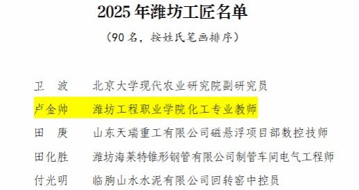 近日,经基层工会推荐、初审筛选、专家评议、实地考察、公示、集中培训等程序,潍坊市总工会评选出2025年“潍坊金牌工匠”“潍坊工匠”“潍坊手造工匠”奖项名单。我院教师卢金帅被评为“潍坊工匠”。