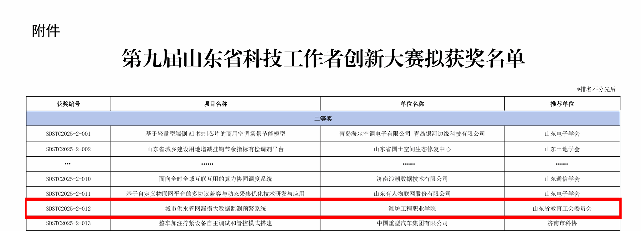 山东省科技工作者创新大赛由山东省科学技术协会、山东省总工会联合主办,是全省科技领域极具影响力的重要赛事。本届大赛聚焦新一代信息技术、高端装备、医养健康等七大重点领域,经初赛评选出全省各地企业、高校、科研院所的281个优质项目入围总决赛同台竞技,最终评出一等奖28项、二等奖58项、三等奖87项、优秀奖57项。由我院信息工程学院张帅、张逸群、孙玲玉等共同完成的参赛项目《城市供水管网漏损大数据监测预警系统》获大赛二等奖。