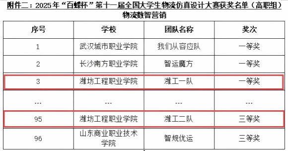 近日,“百蝶杯”第十一届全国大学生物流仿真设计大赛总决赛圆满落幕。我院参赛团队凭借出色的创新设计与实践能力,斩获全国一等奖一项、三等奖一项,充分展现了我院物流专业人才培养的显著成效。
