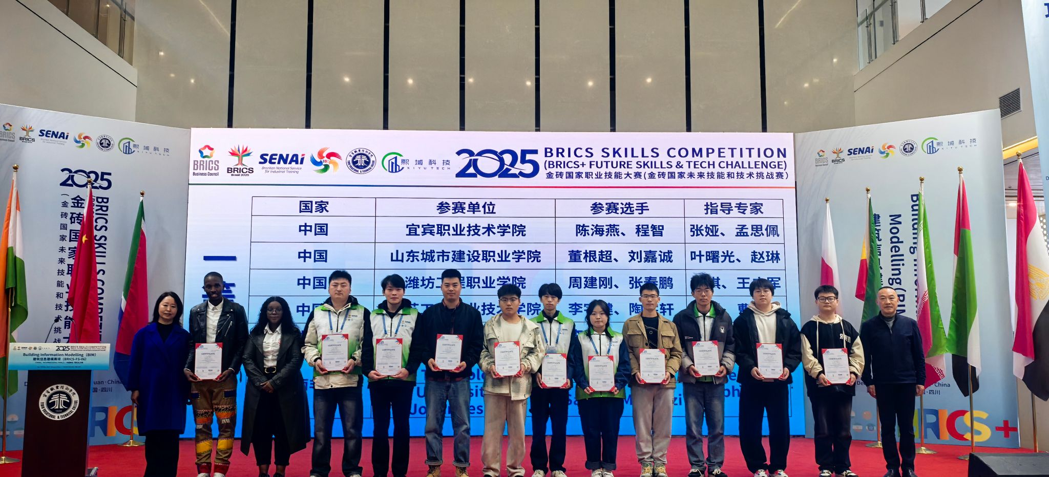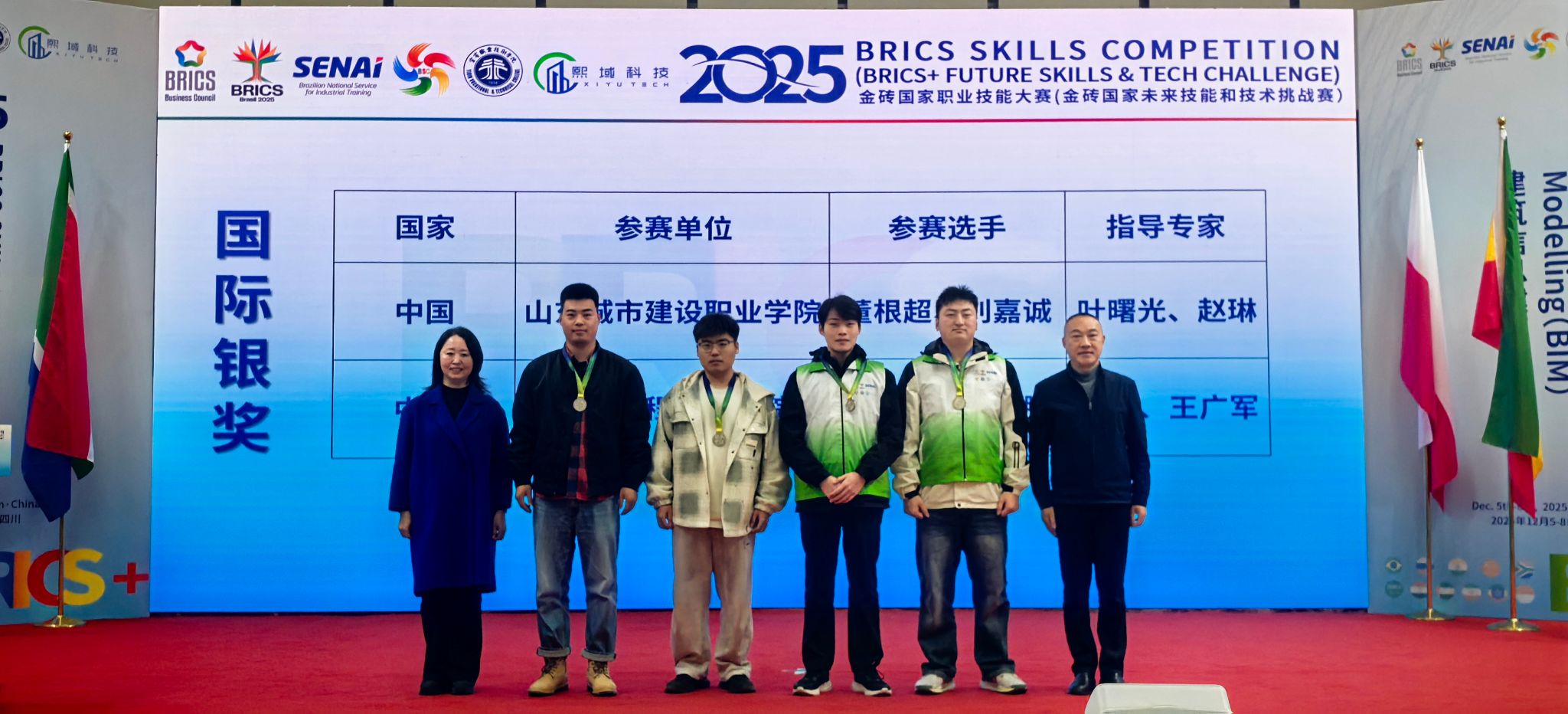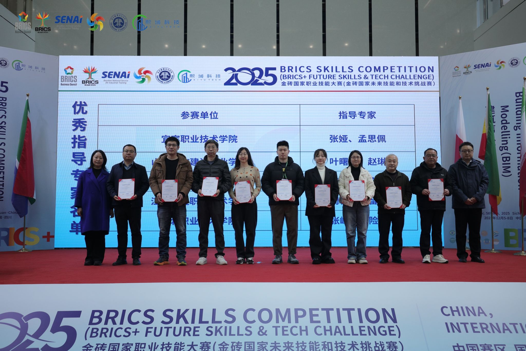 12月8日,2025金砖国家职业技能大赛(金砖国家未来技能和技术挑战赛)建筑信息建模赛项国际总决赛在宜宾职业技术学院落幕。我院建筑工程学院教师周建刚、学生张春鹏组成的参赛队历经全国选拔与国际竞技,最终斩获全国总决赛一等奖及国际总决赛银奖。指导教师韩琪、王广军获评“优秀指导专家”。