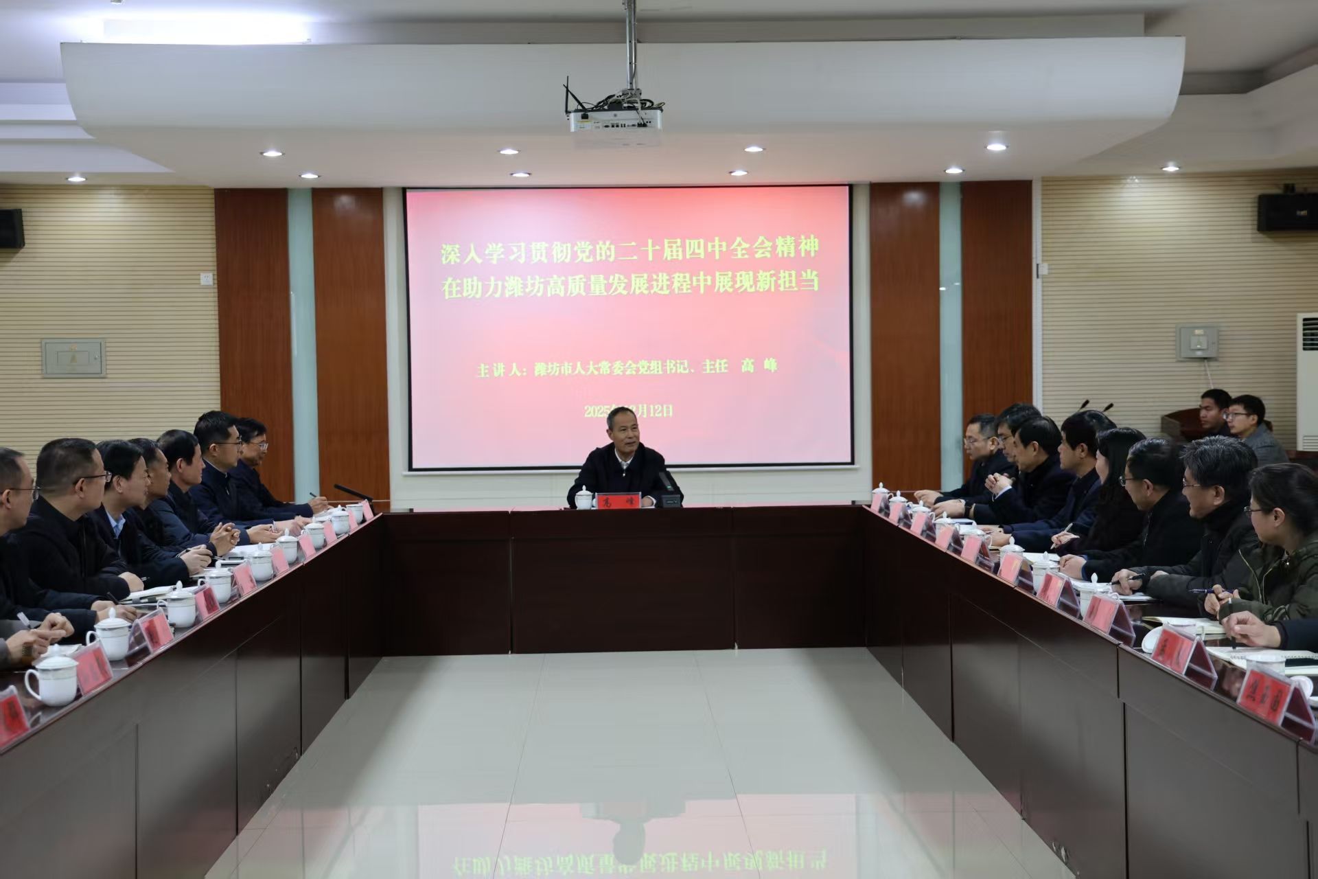12月12日,市人大常委会党组书记、主任高峰到学院为师生代表讲授思政课,宣讲党的二十届四中全会精神,调研有关工作。学院党委书记吕尧良,党委副书记、院长王忠山,市人大常委会秘书长田元君参加。