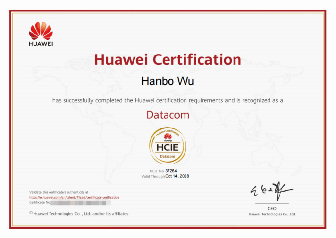 近日,我院虚拟现实技术应用专业学生吴函博顺利通过2025年华为HCIE-Datacom专家级认证考试(数据通信ICT专家)。