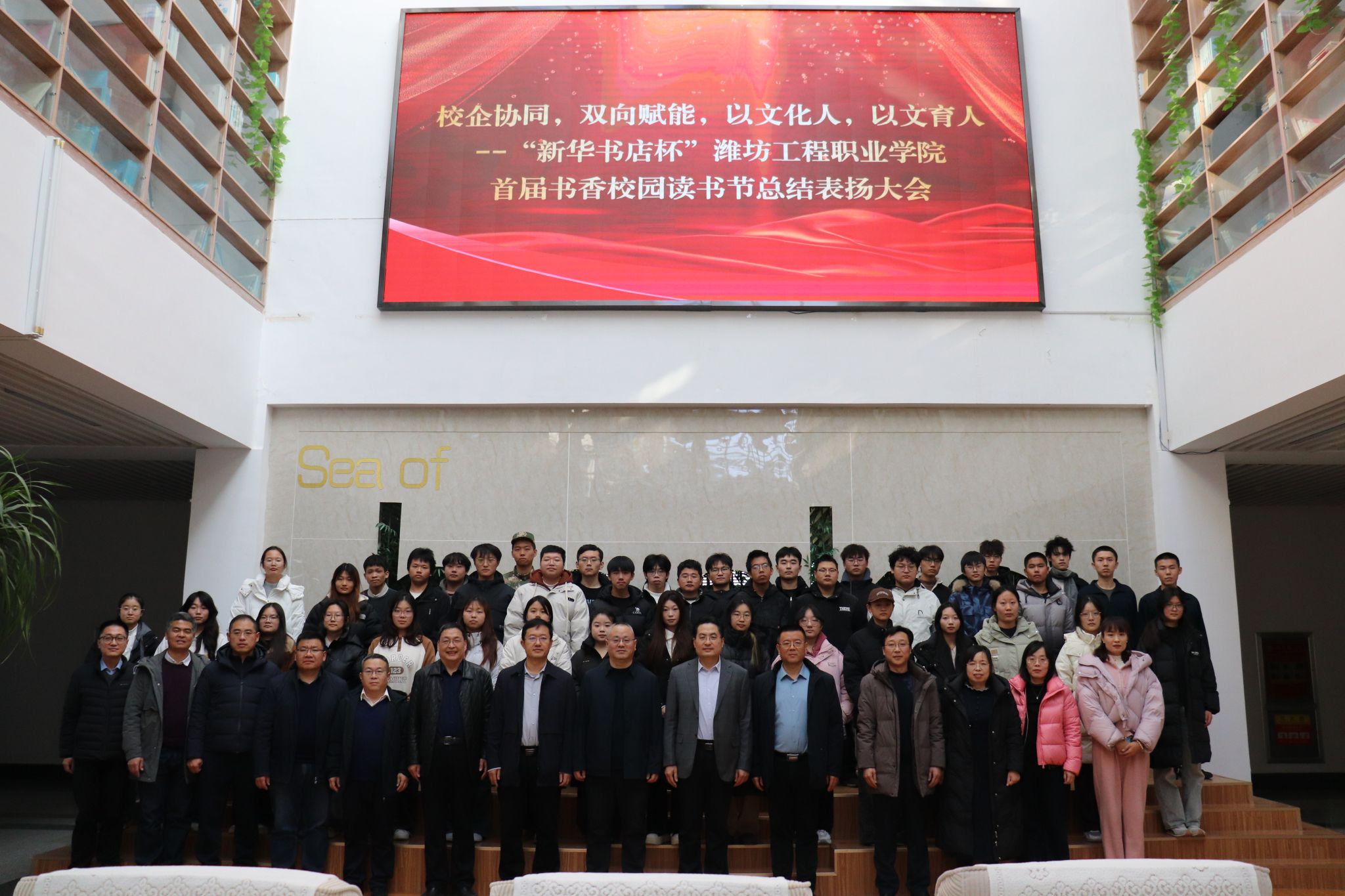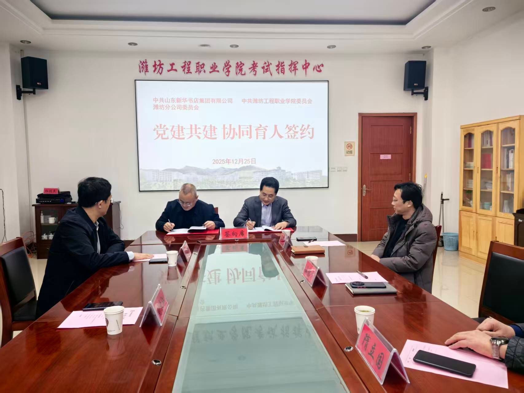 12月25日,山东新华书店集团有限公司潍坊分公司党委书记、总经理刘大江一行来院,参加党建共建协同育人签约仪式暨书香校园读书节总结表扬活动。学院党委书记吕尧良,党委委员、宣传部部长王德才出席相关活动。团委、学生工作处、图书信息中心、相关二级学院负责人参加。