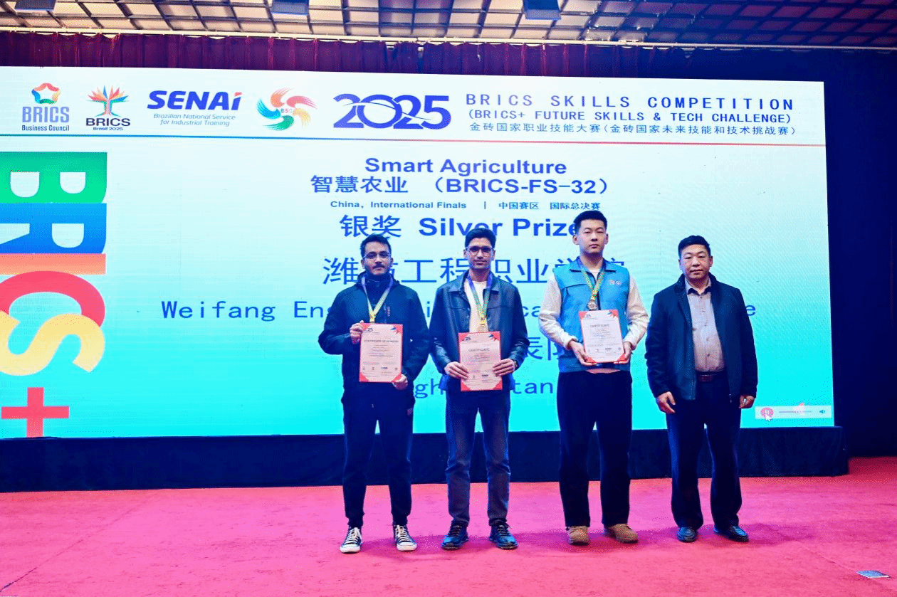本次大赛由巴西国家工业技能培训服务中心、金砖国家工商理事会联合主办,以“聚焦高端制造、数字经济、新产业、新业态、新技术等重点领域,培养国际化高质量技术技能人才”为核心主旨,是金砖国家职业教育领域规格最高、覆盖面最广、影响力最强的国际赛事之一。其中,智慧农业赛项紧密贴合行业发展前沿,以真实智慧农业项目为依托,涵盖项目实施全流程任务,全面考察选手在物联网部署、人工智能应用、农业技术融合等方面的知识储备与综合实操能力。赛事吸引了中国、阿富汗、巴基斯坦、南非、印度、加纳等多个国家的50支精锐队伍同台竞技。竞赛现场,面对复杂的任务要求与高强度的竞争环境,我院参赛队沉着冷静、默契配合,凭借扎实的专业功底、娴熟的实操技能和清晰的解题思路,在平台搭建、系统调试、软件编程等关键考核环节中稳步推进,精准完成各项竞赛任务,以出色的表现赢得评委团的一致认可,成功斩获赛项银牌,尽显我院学子的专业风采与综合素养。