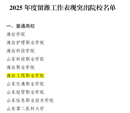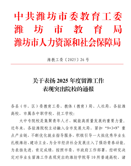 近日,中共潍坊市委教育工委、潍坊市教育局、潍坊市人力资源和社会保障局联合发文,通报表扬2025年度毕业生留潍工作表现突出院校,学院光荣上榜。此次表彰是对我院主动融入潍坊发展大局、精准推进毕业生留潍就业工作的充分肯定,彰显了学院作为区域人才培养高地的责任与担当。
