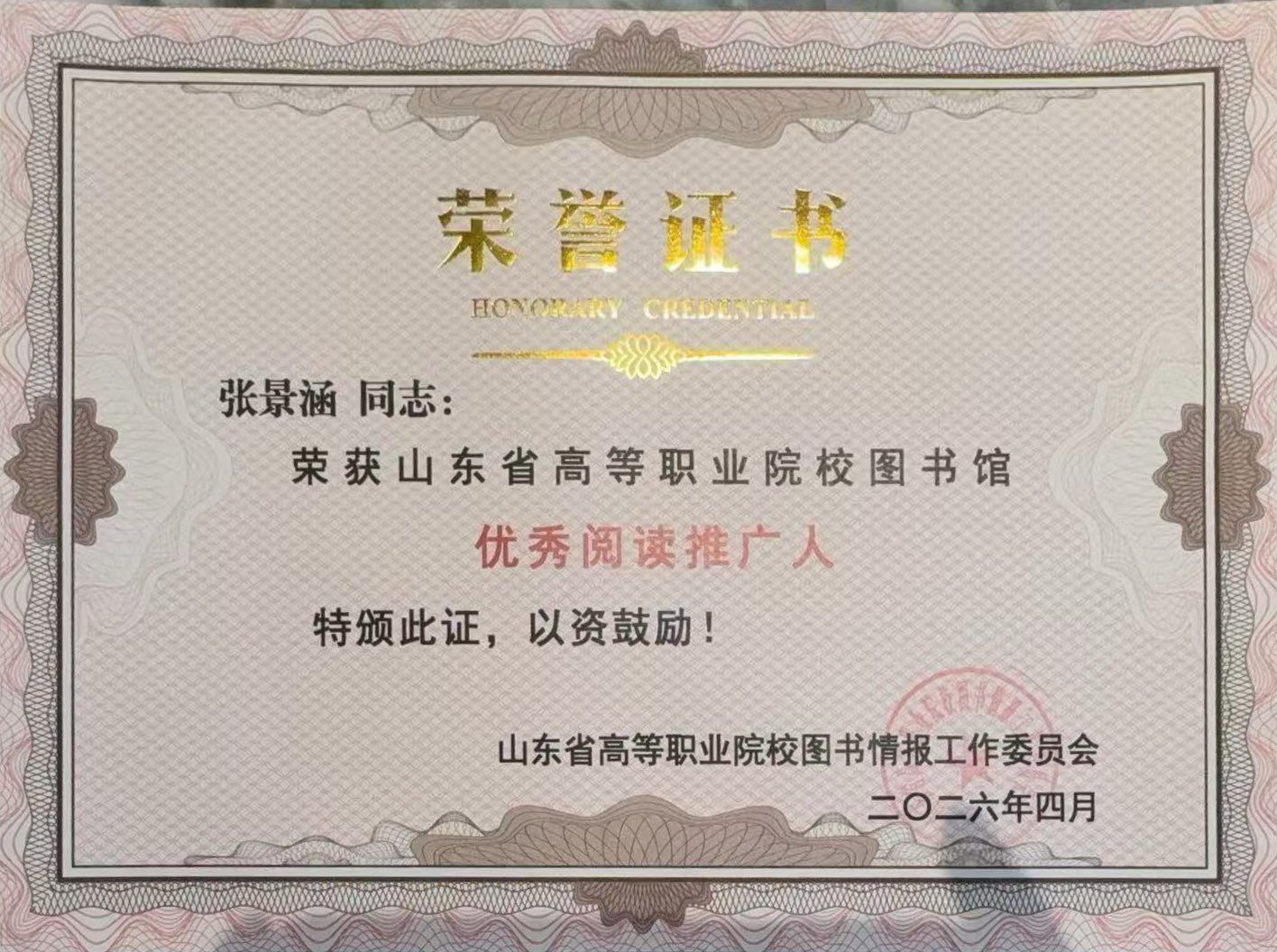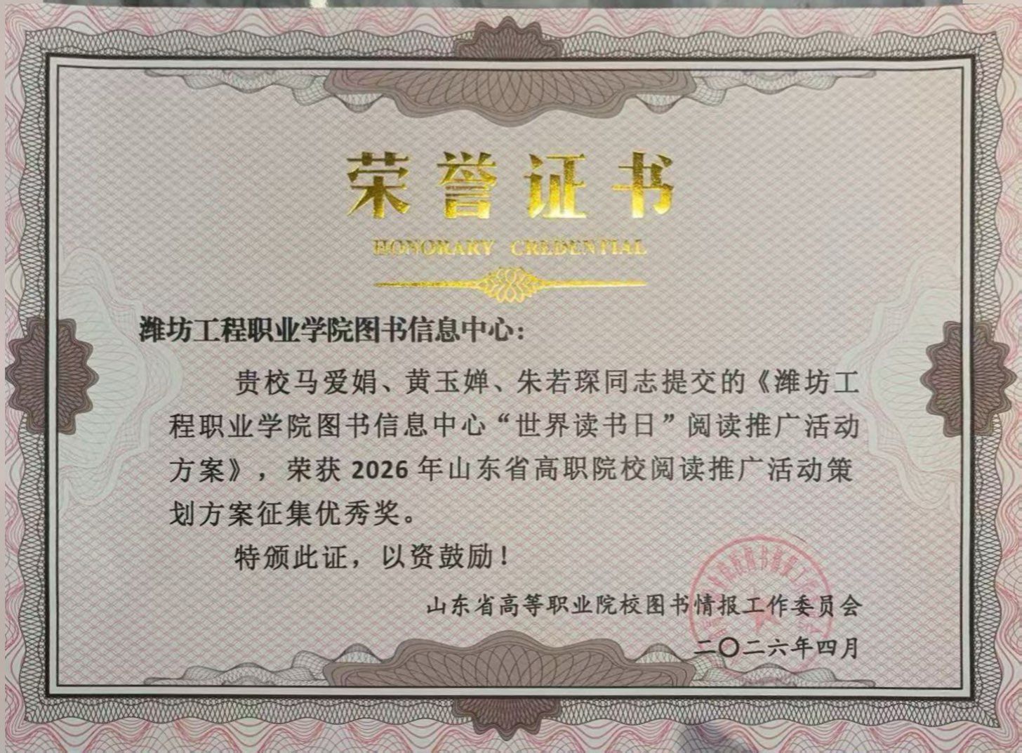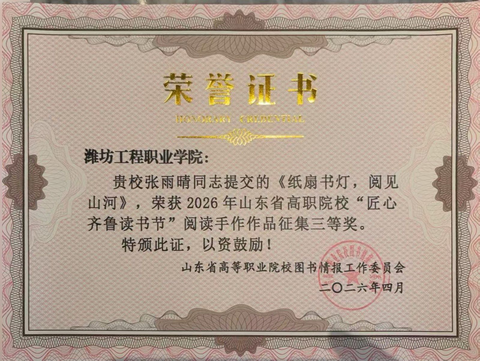 近日,山东省高等职业院校图书情报工作委员会公布了2026年山东省高职院校系列阅读推广活动评选结果。我院师生在多项活动中表现突出,取得优异成绩。其中,我院报送的“世界读书日”阅读推广活动方案兼具创新性与实用性,获优秀奖;图书信息中心张景涵老师在2026年度山东省高职院校图书馆优秀阅读推广人评选中,获“优秀阅读推广人”称号;在山东省高职院校“匠心齐鲁读书节”阅读手作作品征集活动中,信息工程学院学生张雨晴创作的作品《纸扇书灯,阅见山河》构思精巧、意蕴深厚,获三等奖。