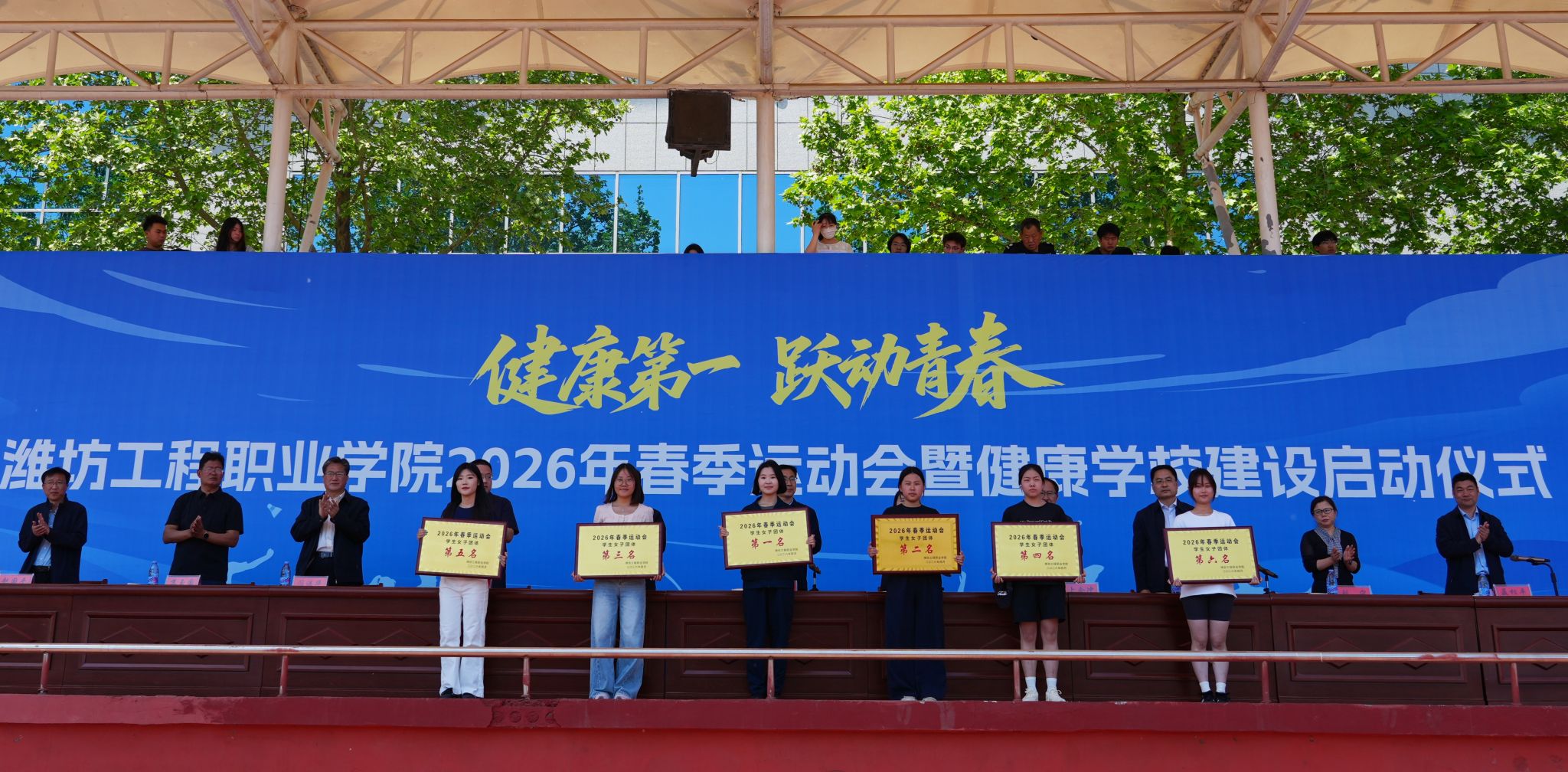 4月24日,大会举行闭幕式。王忠山表示,此次运动会是学院健康学校建设的一次集中展示和生动实践,既是对师生身体素质和精神风貌的全面检阅,更是对“健康第一”教育理念的深入践行。他强调,要坚持健康第一,把运动变成日常习惯,积极运动、科学锻炼,快乐工作、健康生活,以强健的体魄、饱满的精神,迎接挑战;要弘扬体育精神,让拼搏赋能成长之路,把“更快、更高、更强、更团结”的体育精神,内化于心、外化于行,在人生赛道上奋勇争先、追求卓越;要主动“走下网络、走出宿舍、走向操场”,积极参与阳光体育运动,在运动中享受乐趣、锤炼意志、增强体魄、收获友谊,共建健康学校,让运动洒满潍工校园。学院负责同志为获奖单位颁奖。