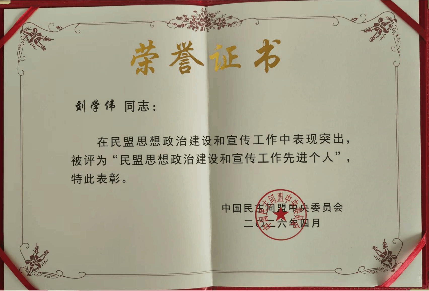 近日,由民盟中央主办的民盟思想政治建设和宣传工作会议在兰州召开,会议对全盟思想政治建设和宣传工作先进集体、先进个人进行了集中表彰。我院民盟盟员、科技处教师刘学伟获评民盟中央“思想政治建设和宣传工作先进个人”荣誉称号。