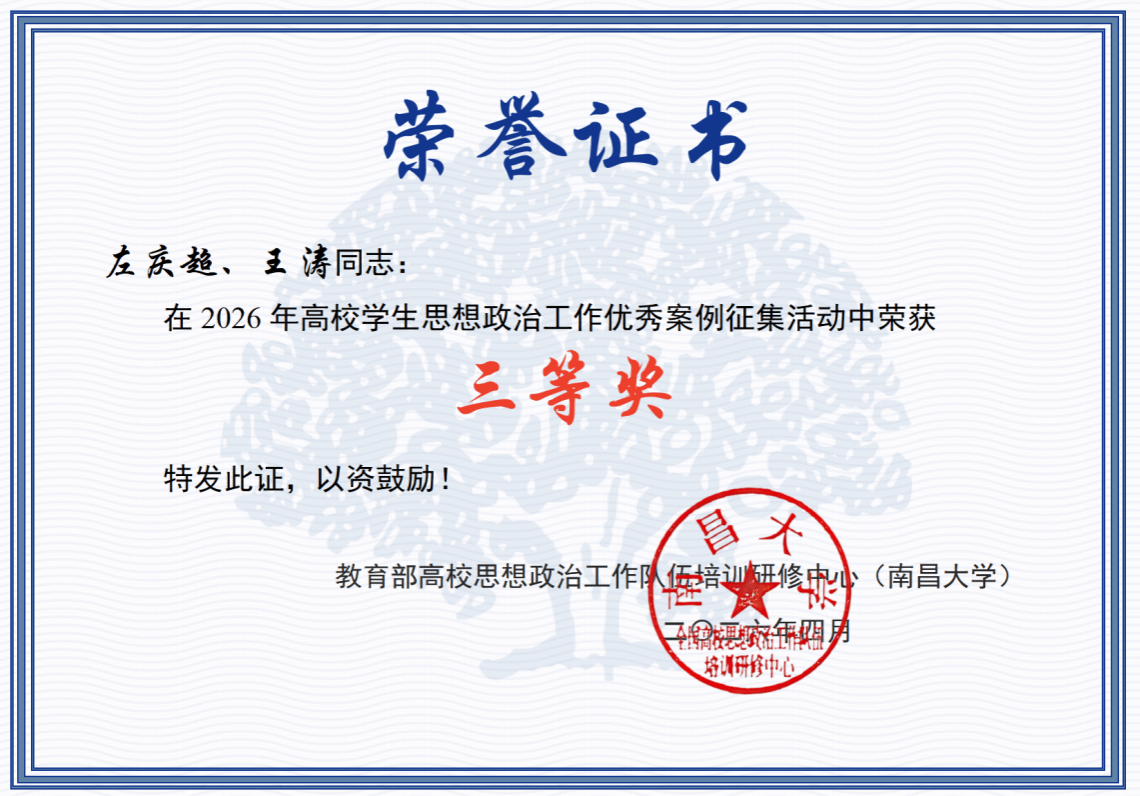 近日,教育部高校思想政治工作队伍培训研修中心(南昌大学)公布了高校学生思想政治工作优秀案例征集活动评选结果。我院建筑工程学院辅导员左庆超、王涛老师申报的案例《从"躺而不平”到“忙而不盲”:一名高职院校家庭经济困难学生的转化实践案例》获评三等奖。