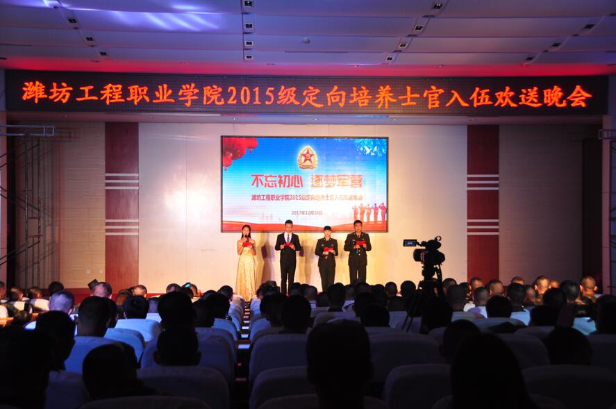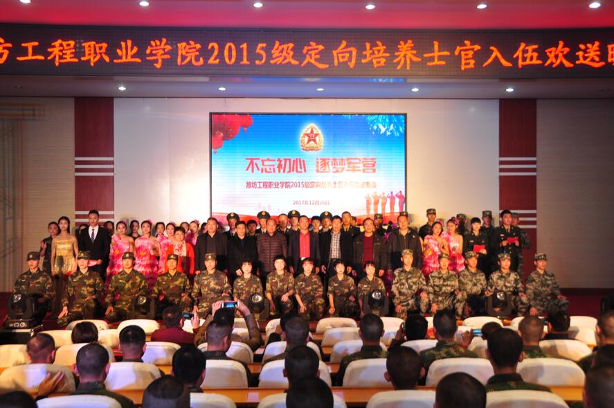 12月26日晚上,我院在学术报告厅举行了潍坊工程职业学院“不忘初心 逐梦军营”2015级定向培养士官入伍欢送晚会。学院副院长韩振华出席晚会现场,与相关系(院)和部门老师、2015级定向培养士官及部分士官家长一起观看了演出。