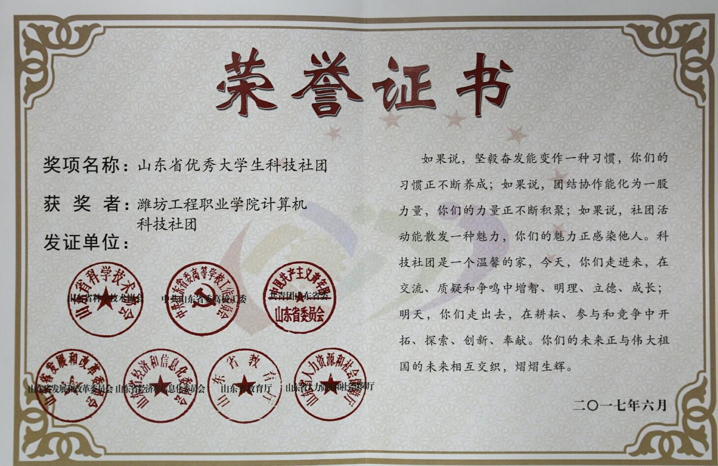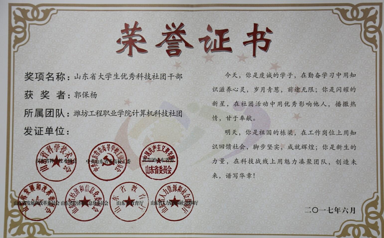 近期,2017年山东省大学生优秀科技社团和优秀科技社团干部评选活动落下帷幕,经选拔、推荐和评审,我院计算机科技社团荣获“山东省优秀大学生科技社团”,郭保杨同学被评为 “山东省大学生优秀科技社团干部”。