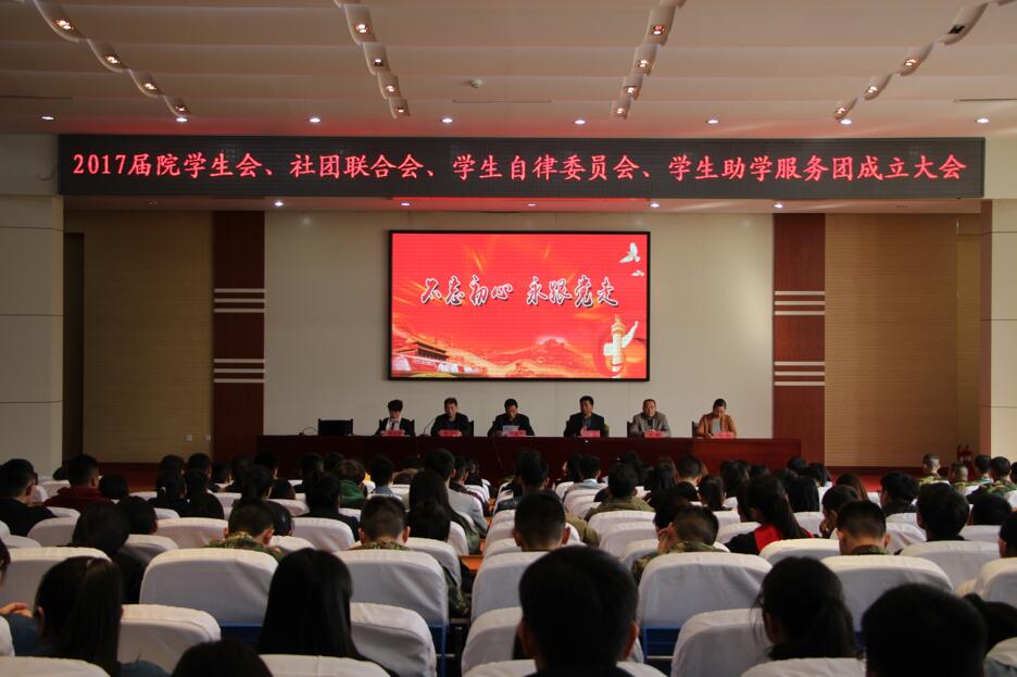 10月26日下午,我院2017届学生会、社团联合会、学生自律委员会、学生助学服务团成立大会在学术报告厅隆重举行。学院副院长韩振华出席会议并讲话,学前教育学院党支部书记杨民为学生干部们作了题为《学生干部的核心素养》的报告,团委学生处负责人、各系(院)团总支书记及400余名学生干部代表参加了会议。会议由团委学生处处长翟江主持。
