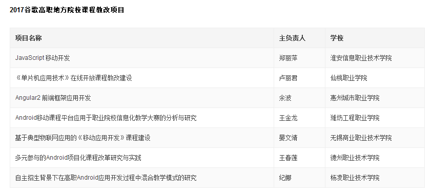 在日前召开的2017Google高职教育合作项目教学展示会上,公布了2017谷歌高职地方院校课程教改项目的立项情况。我院信息工程系王金龙老师主持的《Android移动课程平台应用于职业院校信息化教学大赛的分析与研究》课题获得批准立项,成为受资助的7个高职教改课题之一,将获得由Google公司提供的1万元经费资助。课题建设研究成果将与全国兄弟院校开源共享,达到精品资源共享的效果。