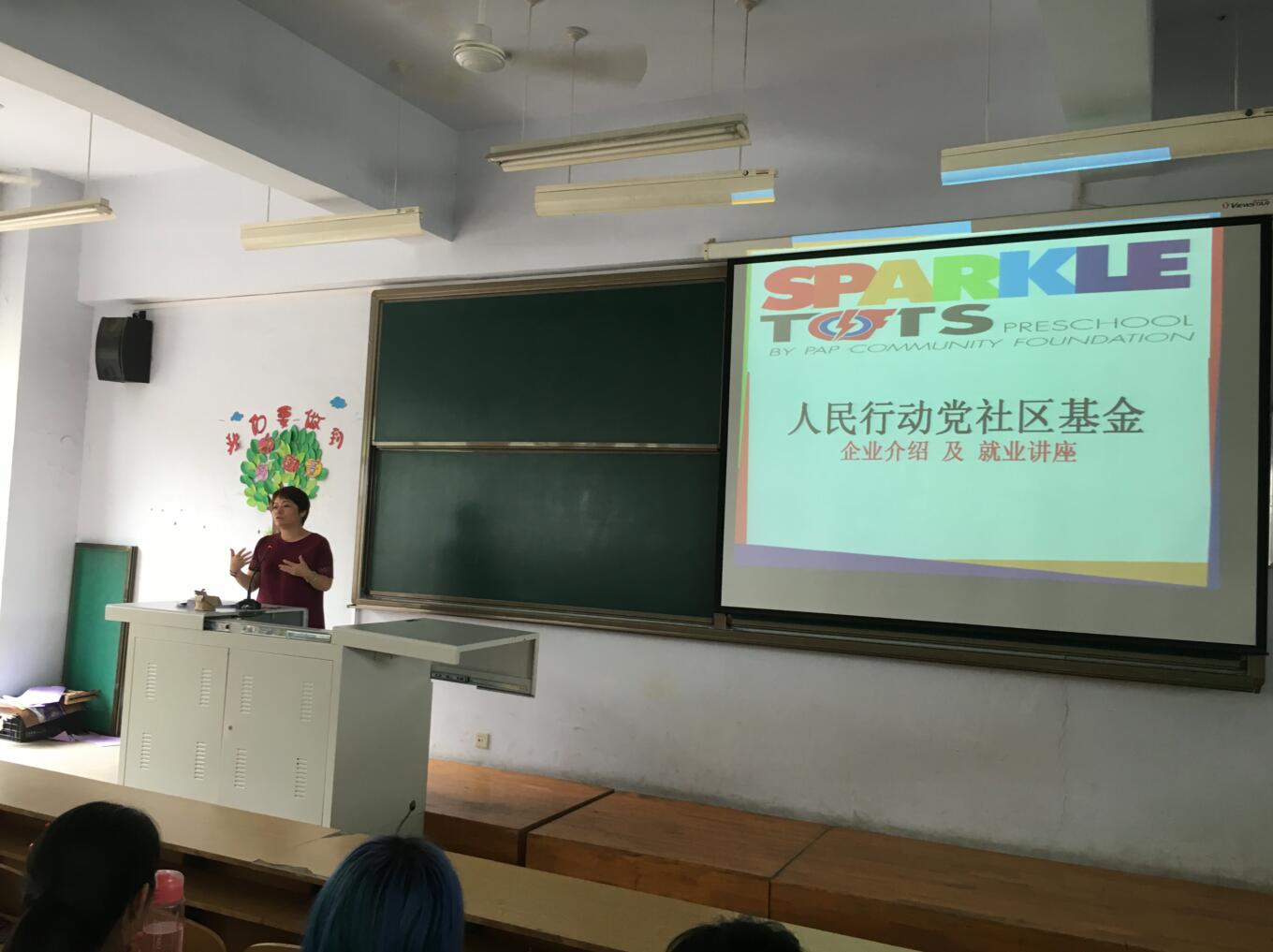 新加坡代表孙雯莉女士向前来应聘的学生介绍了新加坡的风土人情和生活习惯,并就人民行动党社区基金举办的幼儿园经营理念、管理方式、工作环境、收入待遇进行了讲解。她还就赴新加坡申请求职的办理程序、材料准备和工作生活等问题与同学们进行了互动交流。她鼓励热爱教育事业、吃苦耐劳、善于创新的学生前往新加坡从事幼教工作。说明会后,新加坡方面对申请的同学逐一进行了现场面试。