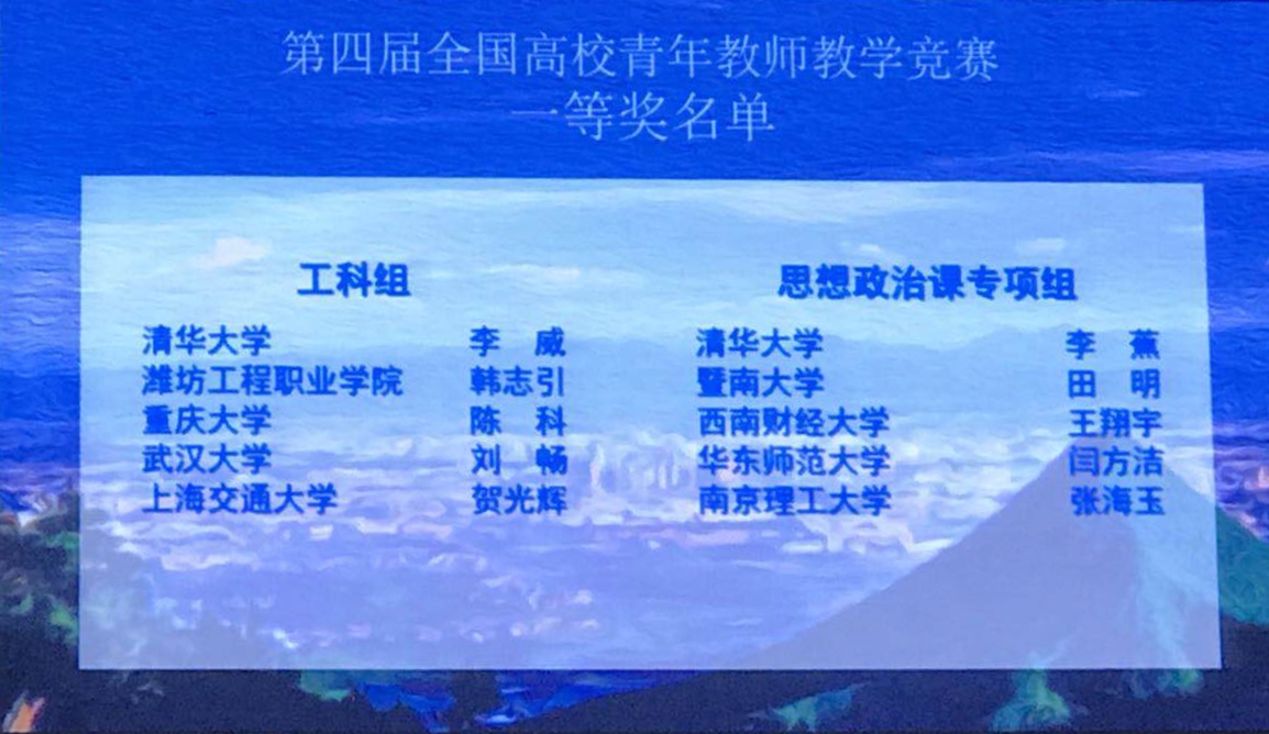 8月31日,在第34个教师节即将到来之际,由中国教科文卫体工会全国委员会主办,浙江省教育工会、浙江师范大学承办的第四届全国高校青年教师教学竞赛决赛在浙江落下帷幕。在决赛中,我院山工机电工程学院韩志引老师获工科组一等奖,填补了该项赛事举办以来山东省一等奖的空白。我院是工科、文科、理科和思想政治专项4个组别中唯一获一等奖的高职院校,工科组获一等奖高校依次为:清华大学、潍坊工程职业学院、重庆大学、武汉大学、上海交通大学。