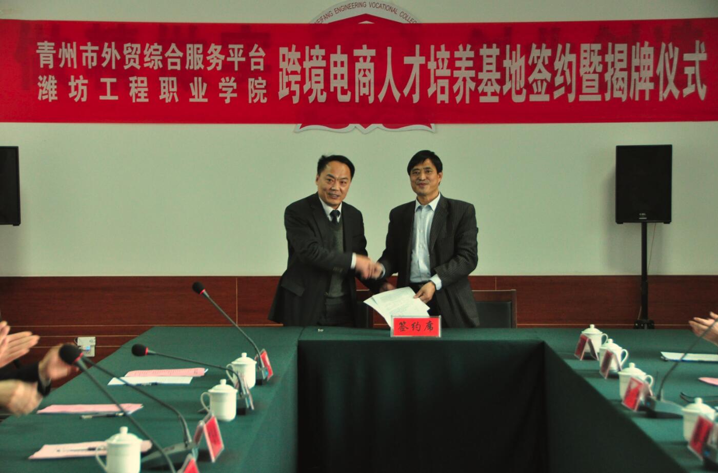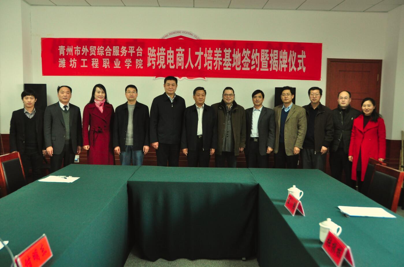 12月27日下午,我院在图书楼208会议室隆重举行了潍坊工程职业学院与青州市商务局、青州市外贸综合服务平台合作办学签约暨跨境电商人才培养基地揭牌仪式。我院院长高立伯,副院长王金明,青州市政府党组成员丁法剑,青州市商务局局长康孝生、副局长邓鞠,青州市外贸综合服务平台董事长付明东,阿里巴巴年度最佳讲师朱定定教授以及我院相关部门领导参加了揭牌仪式。
