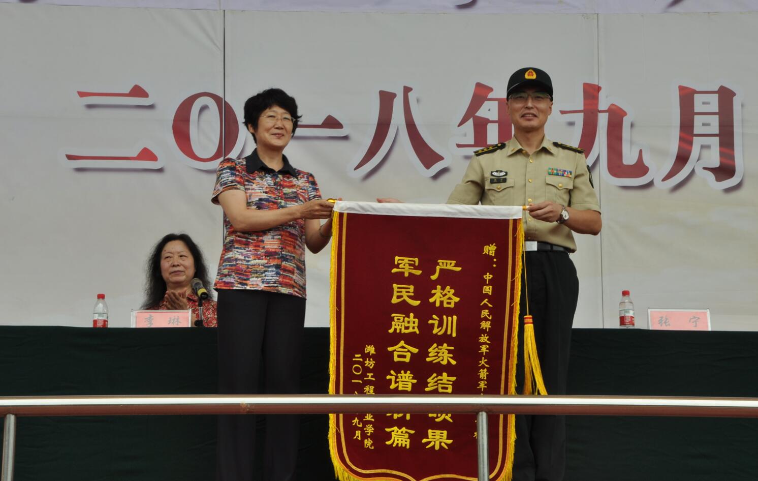 会上,纪委书记那菊华代表学院向部队首长赠送锦旗,大会在全场师生热烈的掌声中圆满结束。