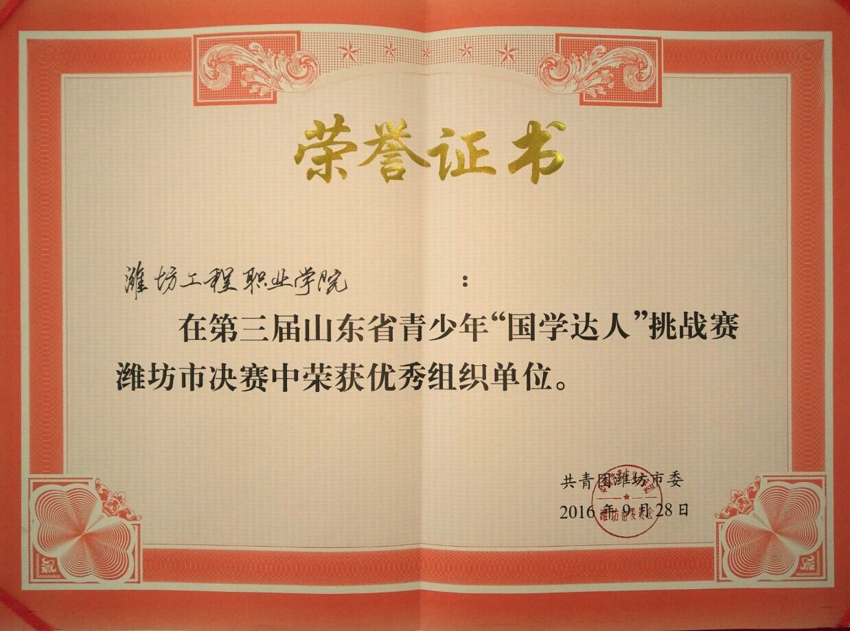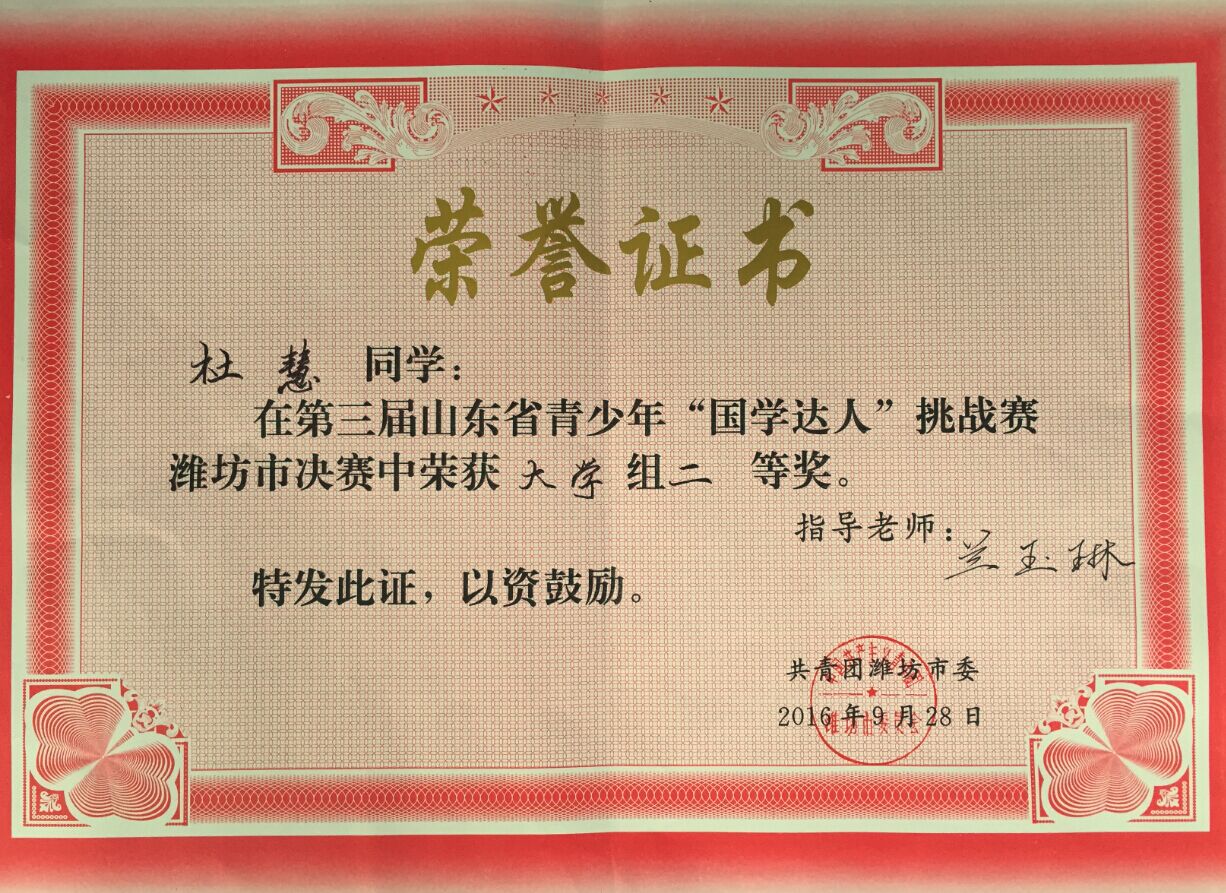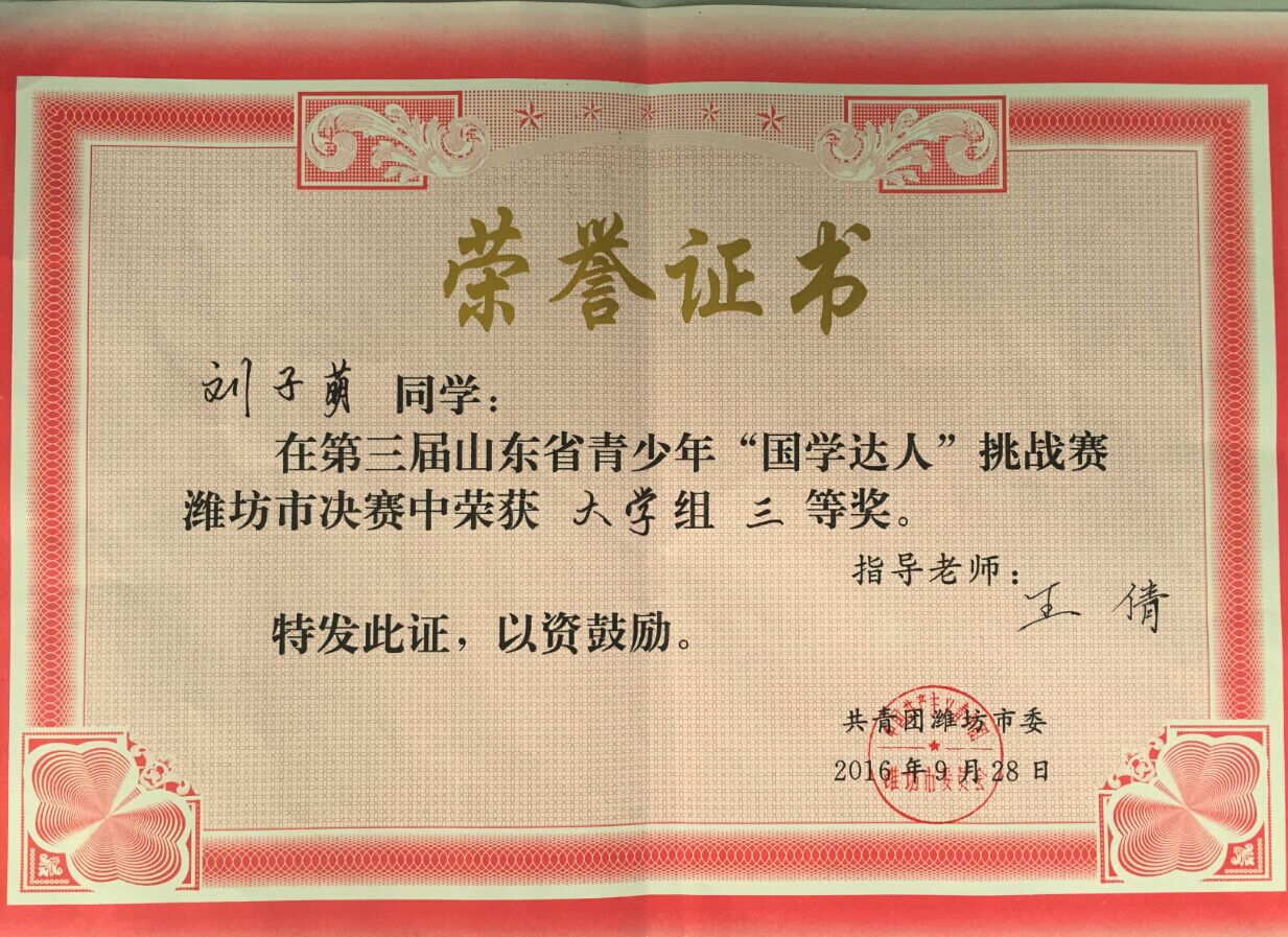为进一步推动国学达人挑战赛的深入开展,大力弘扬中华优秀传统文化,引导、激励青年学生积极行动、踊跃参赛,以实际行动践行社会主义核心价值观。9月27日,由共青团潍坊市委主办的2016年“国学达人”挑战赛市级决赛顺利开赛。来自潍坊市十余所高校的三十多名选手,经过登科会战、大魁天下两个单元的激烈角逐,我院隆昊、杜慧同学获得大学组二等奖、刘子萌同学获得大学组三等奖。