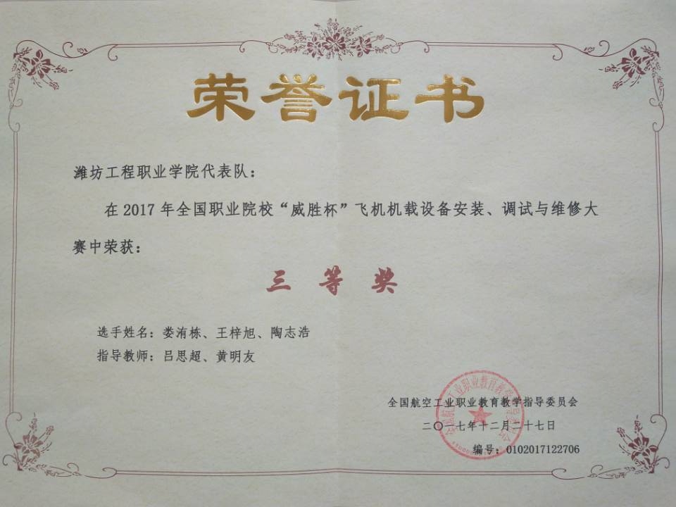 12月26日,由全国航空工业职业教育教学指导委员会举办的首届全国职业院校“威胜杯”飞机机载设备安装、调试与维修大赛在西安阎良成功开赛。航空工程学院派出的由吕思超、黄明友老师指导的学生娄洧栋、王梓旭、陶志浩代表队,取得了大赛总成绩第6名、团体三等奖的好成绩。