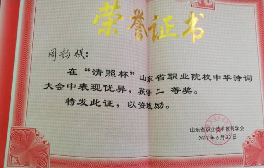 6月22日,在著名女词人李清照故乡济南章丘举办了“清照杯”山东省职业院校中华诗词大会,全省近50所高职院校的师生参与了此次大赛,大赛分为预赛和决赛两个阶段,重点考察参赛选手诗词方面的综合知识,经过激烈角逐,我院信息工程系士官班周韵棋同学和学前教育学院李广兴老师分别获得学生组二等奖和教师组二等奖的优异成绩。