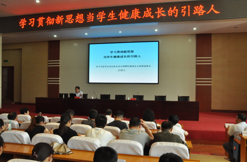 报告会上,王建立教授为全体教职工作了题为《学习贯彻新思想当学生健康成长的引路人》的报告。他对习近平总书记在北大师生座谈会和纪念马克思诞辰200周年大会上的重要讲话精神进行了解读,从“一个根本任务”“两个标准”“三项基础性工作”“四点希望”四方面深刻阐述了学习贯彻新思想的时代内涵。他表示,大学是立德树人、培养人才的地方,教育就是要培养德智体美全面发展的社会主义建设者和接班人。高校只有抓住培养社会主义建设者和接班人这个根本,才能办出、办好中国特色世界一流大学。一是坚持办学正确政治方向。要把立德树人的成效作为检验学校一切工作的根本标准,真正做到以文化人、以德育人。二是建设高素质教师队伍。要从培养社会主义建设者和接班人的高度,考虑大学师资队伍的素质要求、人员构成、培训体系等。加强师德师风建设,引导教师把教书育人和自我修养结合起来,做到以德立身、以德立学、以德施教。三是形成高水平人才培养体系。要瞄准世界科技前沿,加强对关键共性技术、前沿引领技术、现代工程技术、颠覆性技术的攻关创新等。